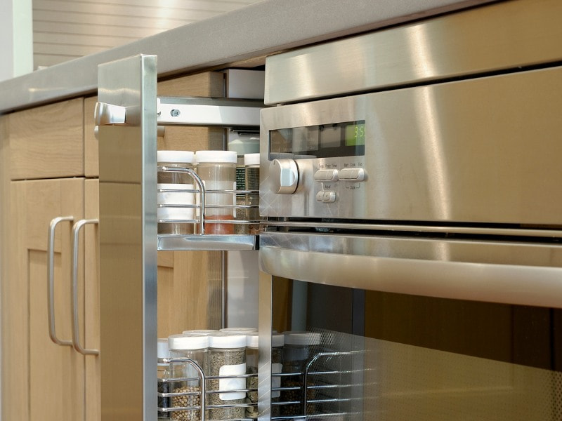 Kệ tủ dọc rất hữu ích trong nhà bếp và thường được sử dụng để lưu trữ chai, lọ. Những đồ nho nhỏ sẽ được cất gọn gàng tại đây thay vì mặt bếp để giữ gìn sử ngăn nắp, gọn gàng.