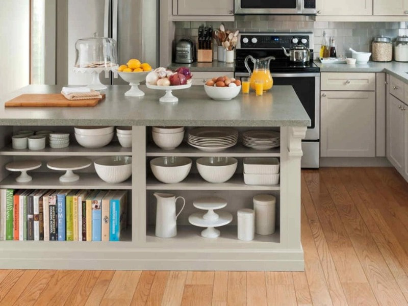 Nếu gian bếp nhà bạn có một bệ bếp riêng lẻ như thế này thì bạn nên sử dụng không gian trống phía dưới để lưu trữ các đồ dùng như: bát, đũa, đĩa, sách, vở,… để tích kiệm không gian bề mặt hơn.