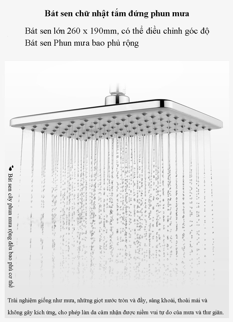 | 1. Bát sen trên cao | Kích thước 260×190mm, tia nước rộng, góc thoát nước điều chỉnh linh hoạt. |