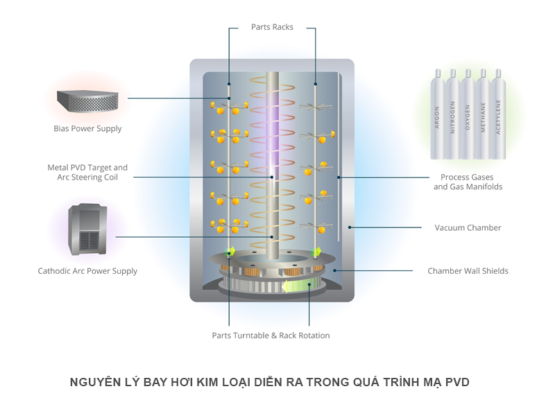 PVD (Physical Vapor Deposition) là công nghệ mạ phủ bề mặt bằng phương pháp bay hơi vật lý trong môi trường chân không. Trong quá trình này, vật liệu mạ (thường là kim loại như titan, crom, zirconium…) sẽ được hóa hơi ở nhiệt độ cao, sau đó ngưng tụ và bám chặt lên bề mặt sản phẩm, tạo thành một lớp phủ mỏng nhưng có độ liên kết rất cao.